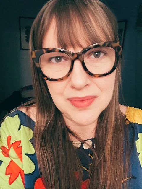 A woman with long brown hair wearing tortoise shell glasses and a colorful dress with a floral pattern, smiling at the camera. That's me, the college counselor!